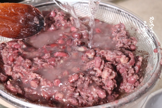 7. 체에 밭치고 삶은 팥에 물을 부어가며 으깨서 걸러줍니다. 물은 총 1.5L를 나눠서 부어줍니다.