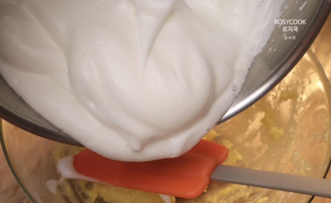 7. 준비해둔 노른자 반죽에 머랭을 부어줍니다.