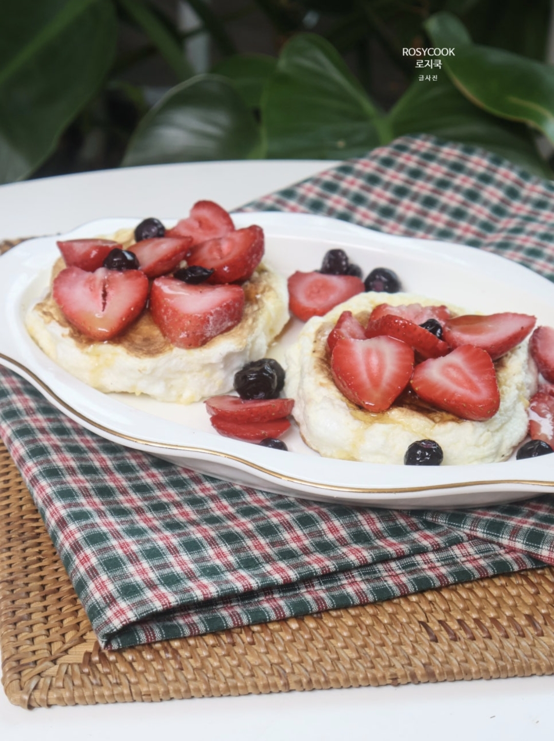 13. 딸기와 블루베리를 올리고, 메이플시럽을 뿌려서 마무리해 줍니다.