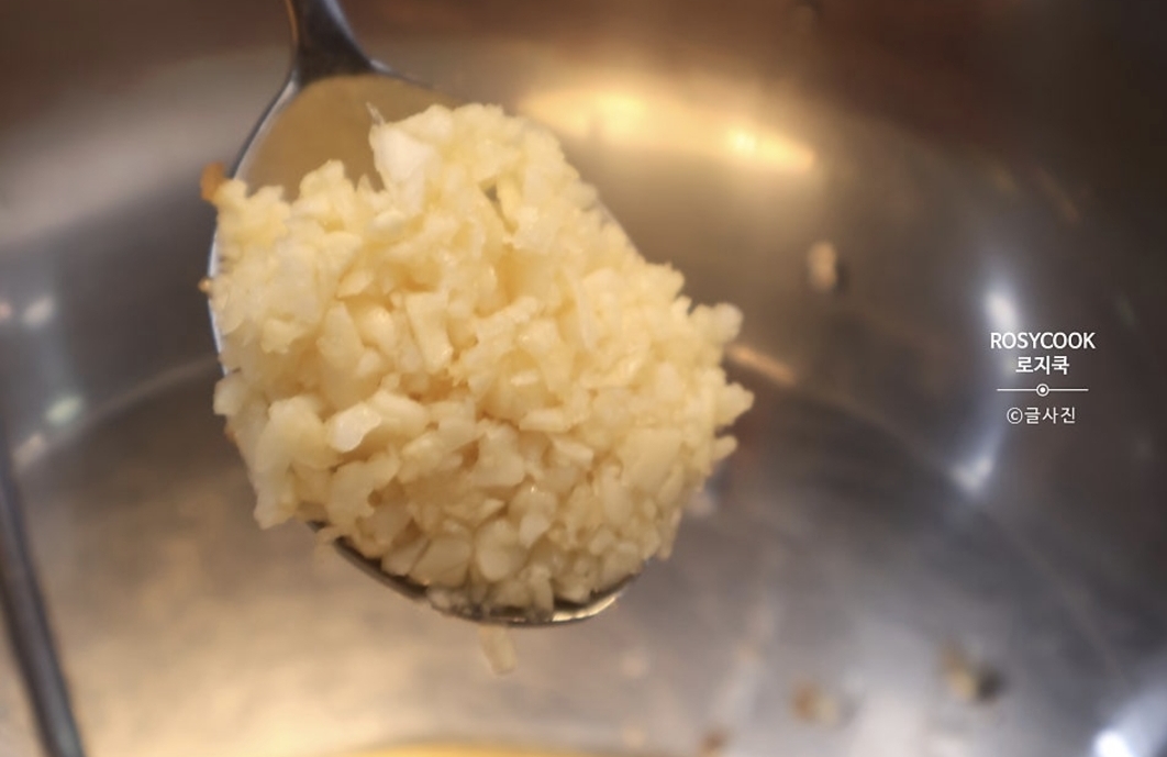 6. 간 마늘 1 큰 술과 양조간장 2 큰 술을 넣어줍니다.