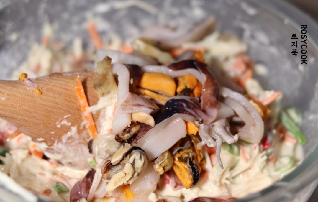 바삭하게 하는 레시피의 핵심은 반죽이 너무 묽지도, 너무 되지도 않게 만드는 것! 재료에 골고루 부침가루가 입혀지면서 날가루가 보이지 않을 정도면 딱 좋습니다. 해물믹스를 1줌 정도 넣고 잘 섞어주세요. 채소와 해물이 잘 어우러진 반죽이 완성됩니다.