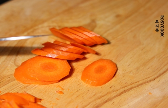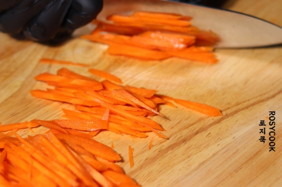 먼저 야채부터 썰어볼게요.당근은 가늘게 채 썰어 식감을 살려줍니다.