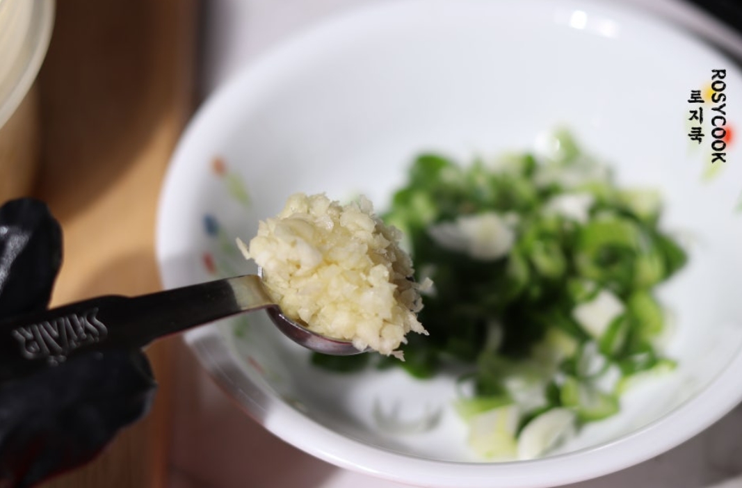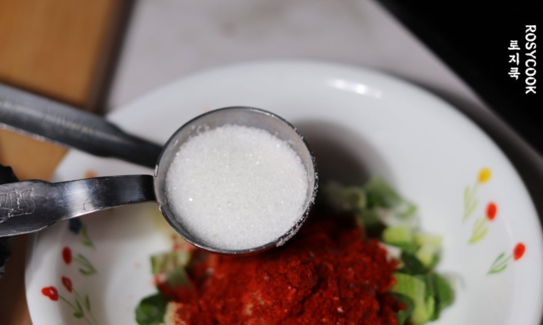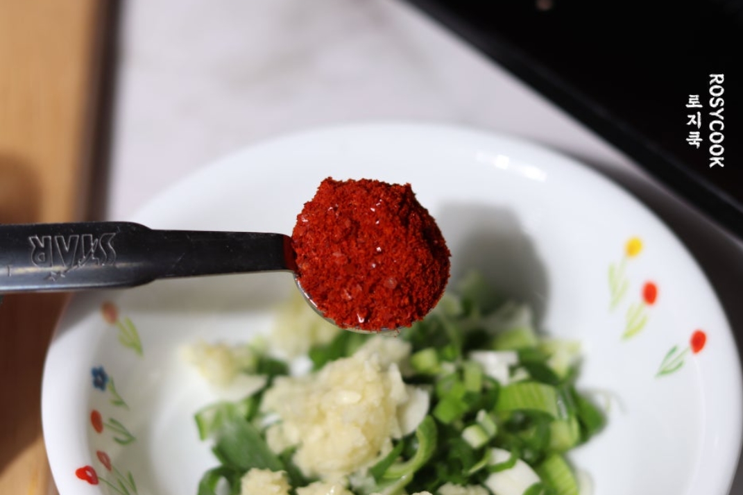 대파 1 큰 술, 간 마늘 2 티스푼, 고춧가루 2 티스푼, 설탕 1/2 큰 술, 양조간장 3 큰 술, 참기름 1 큰 술을 넣고 골고루 섞어주세요.