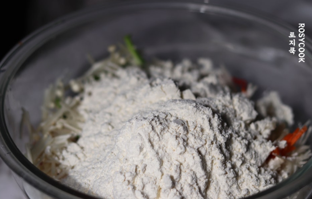 손질한 채소(대파 제외)를 볼에 모두 담고, 부침가루 2컵을 넣어줍니다. 여기에 물 300ml를 조금씩 나눠 넣으며 반죽 농도를 조절해주세요.