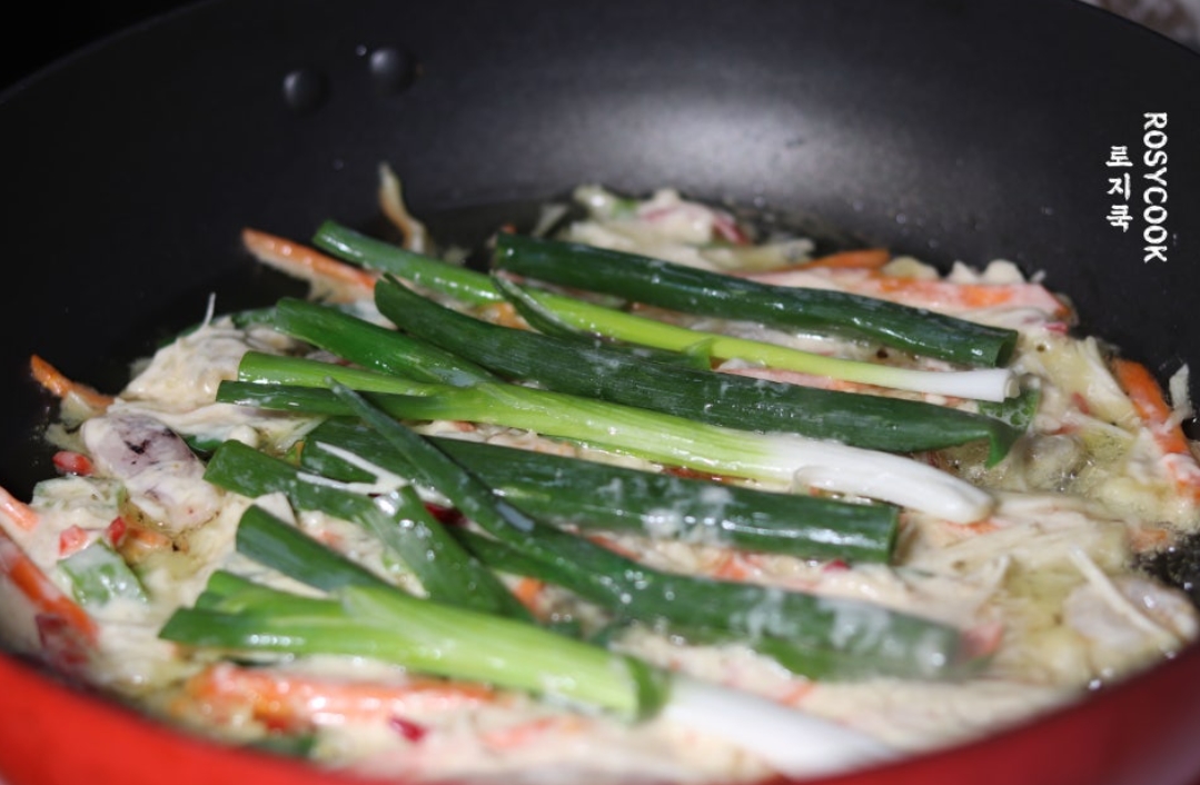 반죽을 한 국자씩 떠서 팬에 넓게 펼친 뒤, 아까 남겨둔 대파를 위에 골고루 올려줍니다.