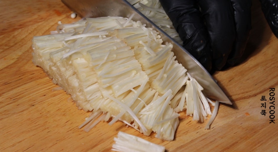 팽이버섯은 밑동을 자른 뒤 3등분해 주세요.