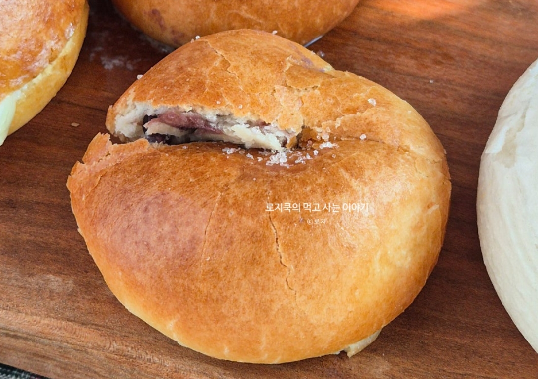 7. 가운데에 소금을 살짝 뿌려줍니다. 소금빵 느낌을 내실 수 있습니다. 에어프라이어에서 160도 15분 구워줍니다. 전체적으로 노릇해질 때까지 구워주시면 됩니다. 호빵 크기와 에어프라이어 출력에 따라 시간은 달라질 수 있습니다.