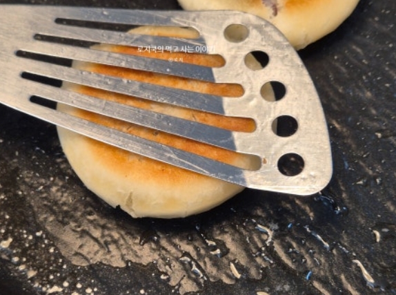 13. 약불에서 천천히 구워주셔야 타지 않습니다. 바닥이 어느 정도 구워졌을 때 접시나 뒤집개로 살살 눌러가며 납작하게 만들어줍니다. 강한 힘으로 갑자기 누르면 깨질 수 있으니 주의하세요. 뒤집어가며 노릇하면서도 바삭해질 떄까지 구워줍니다.