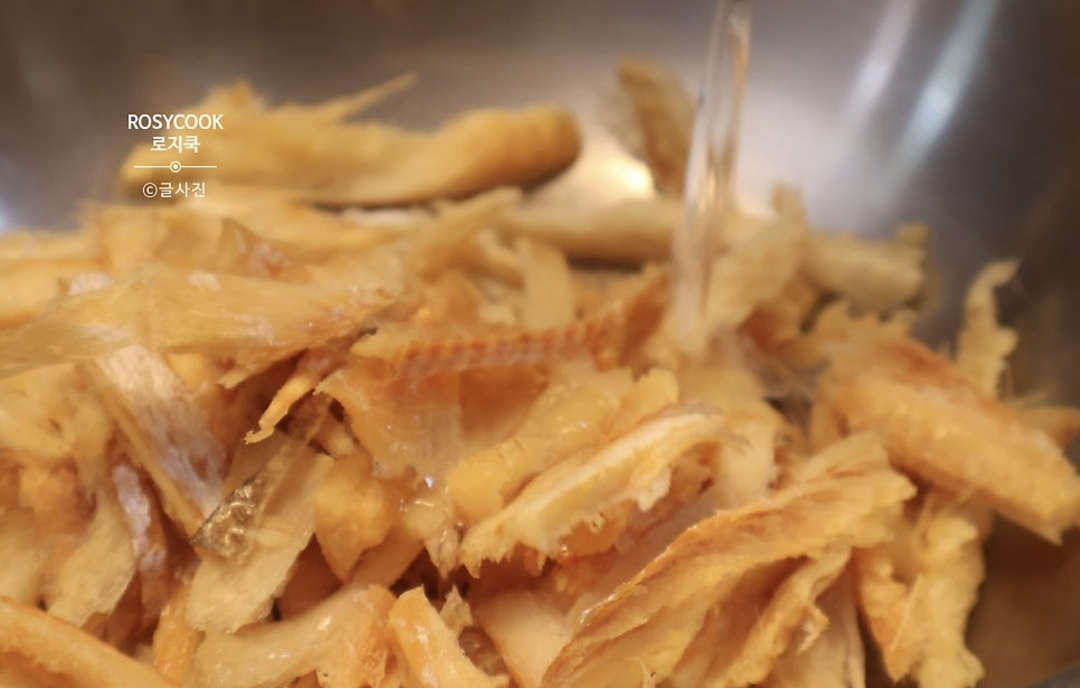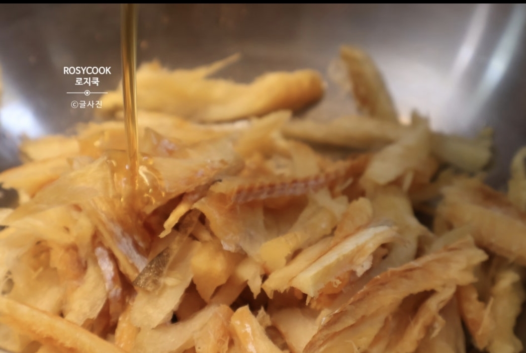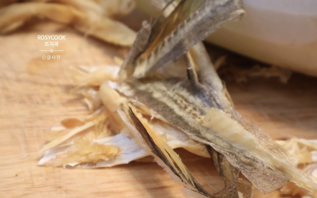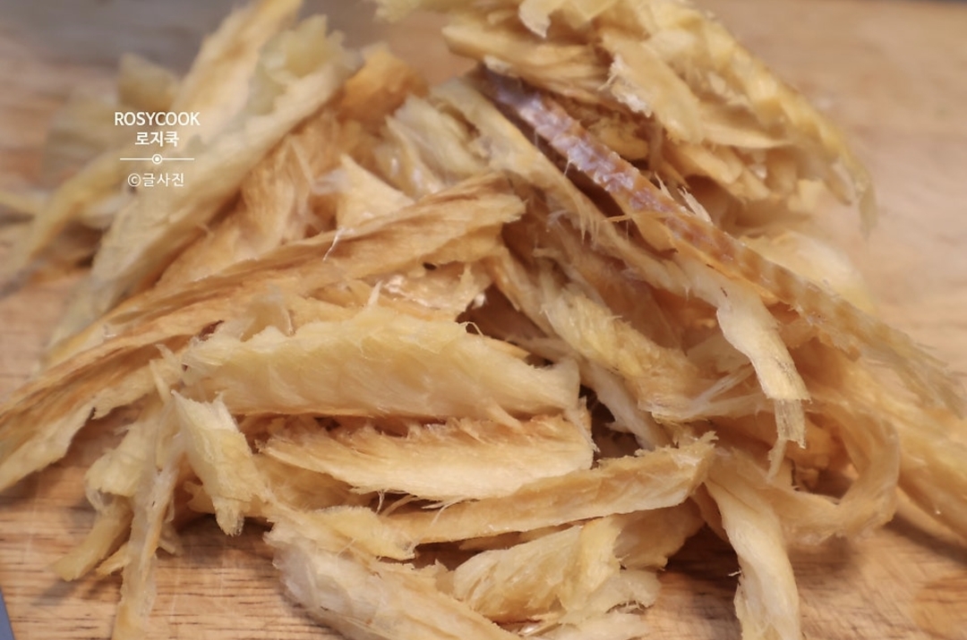 4. 껍질 부분을 제거해 준 후, 찢은 황태포를 먹기 좋게 한 번 썰어줍니다.