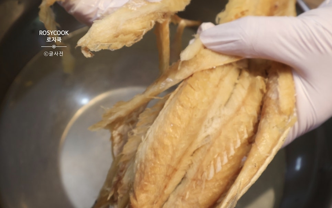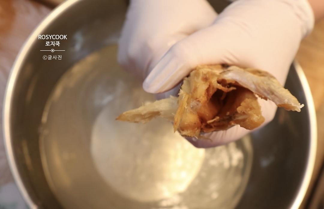 1. 황태포의 대가리 부분을 제거해 줍니다. 꼬리지느러미를 제거해 줍니다.