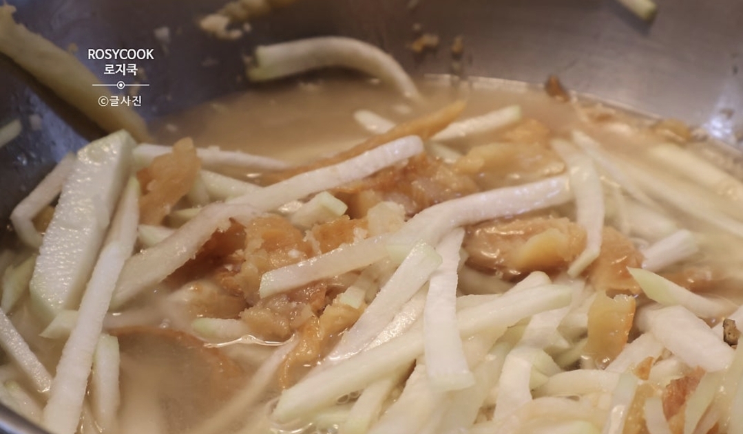 무로 시원한 맛을 살려봤고 콩나물을 넣어 아삭한 맛도 내봤고요. 황태포를 찢어서 끓여봤으니 뽀안 황태국 끓이는 방법 참고해서 드셔보시길 바랍니다. 황태채를 사용하셔도 괜찮습니다.
