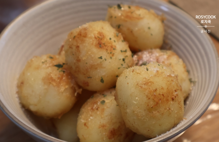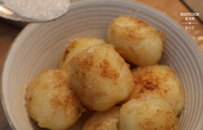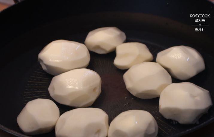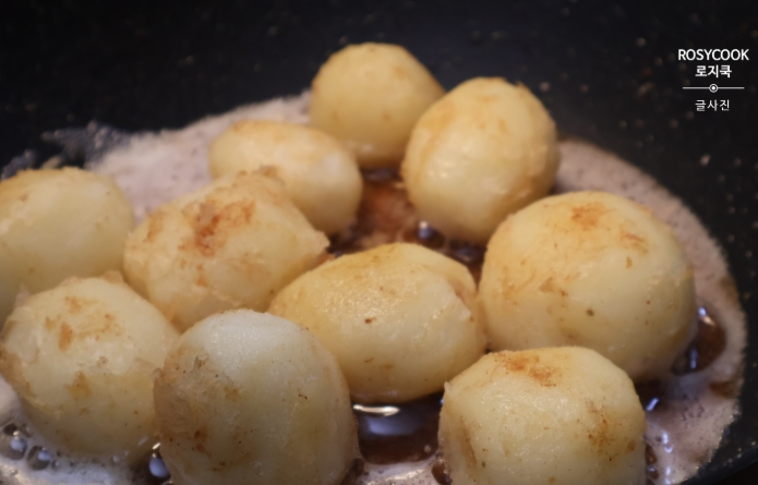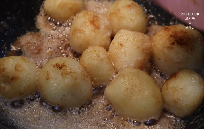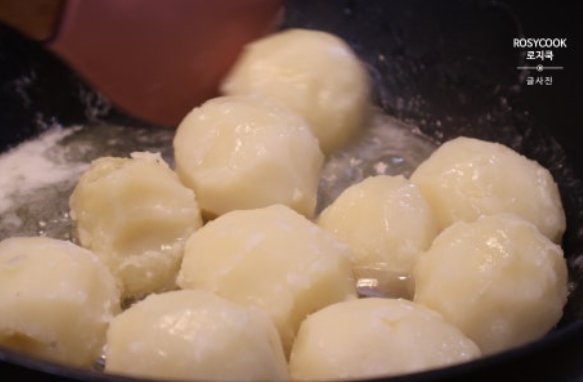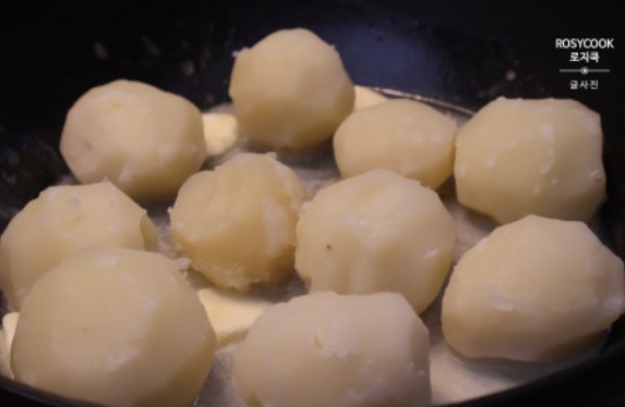 삶은 감자를 넣고 굴려가며 노릇노릇하게 구워줍니다.