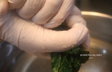 10. 케일을 넣고, 1분 정도 데쳐줍니다. 찬물에 담가서 헹궈준 후, 물기를 꽉 짜서 준비해 줍니다.