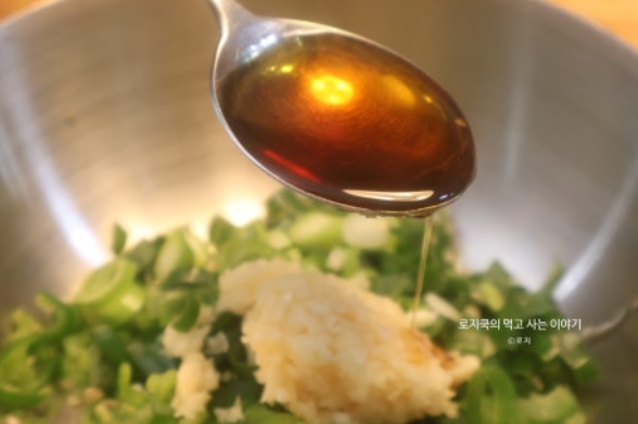 4. 간 마늘 1 큰 술, 참기름 1 큰 술을 넣어줍니다.