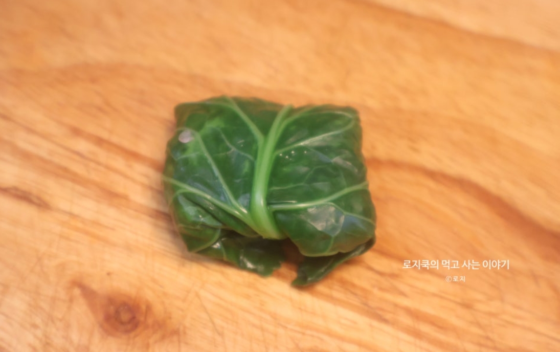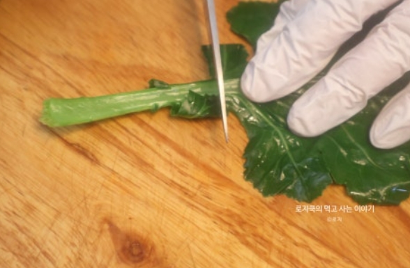 11. 데친 케일의 줄기 부분을 제거해준 후 깔아줍니다.