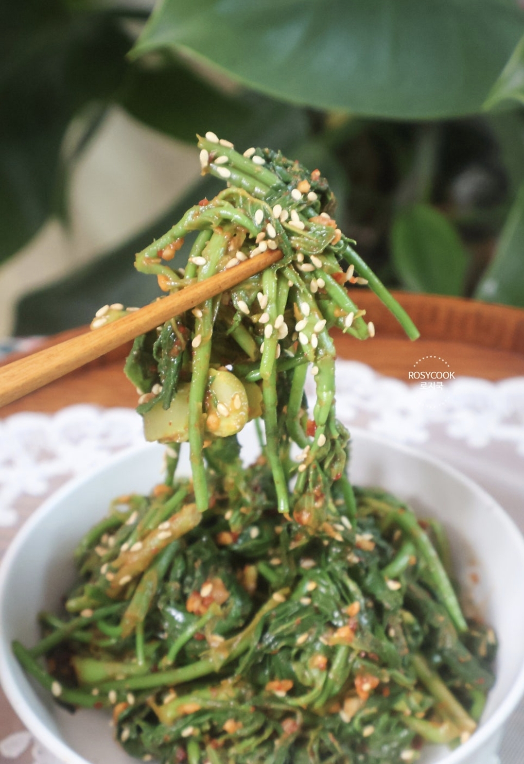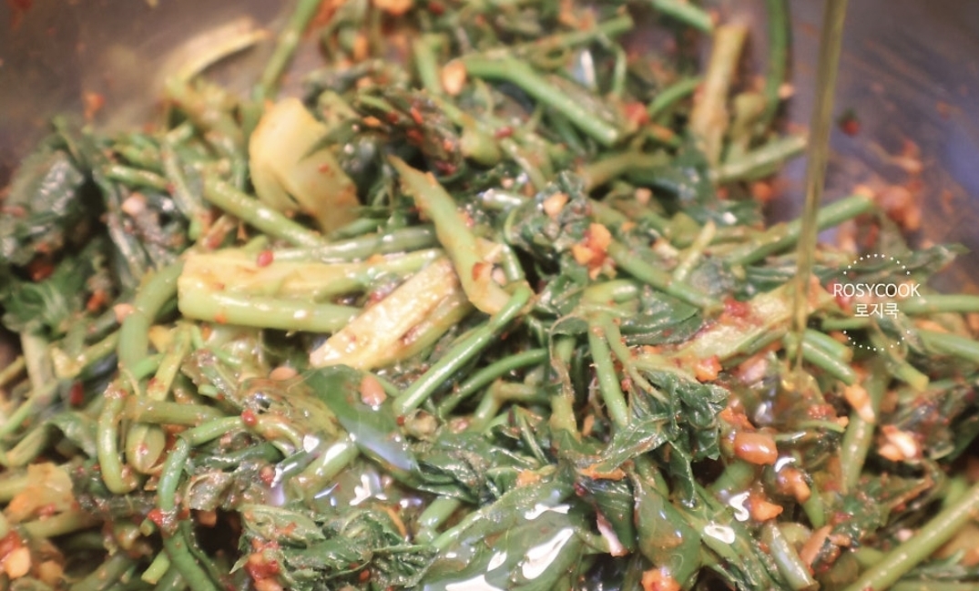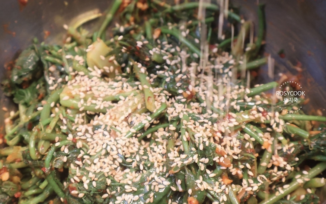 10. 들기름 2 큰 술을 둘러주시고, 깨를 전체적으로 뿌려서 다시 조물조물 무친 후, 마무리합니다.