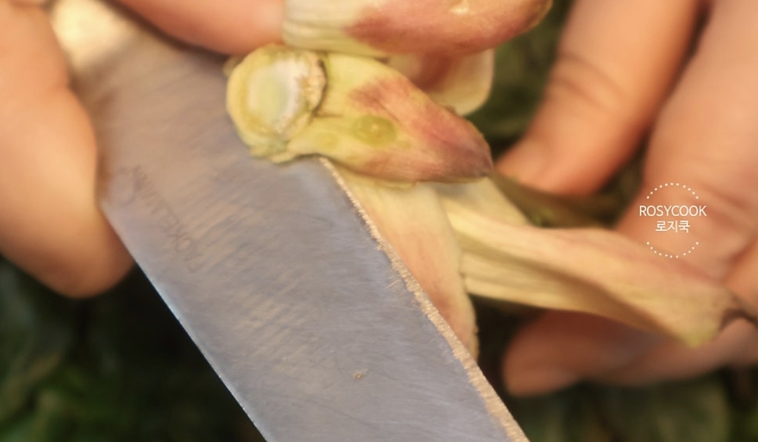 5. 준비해둔 엄나무순의 줄기 부분을 반으로 갈라서 쪼개줍니다.